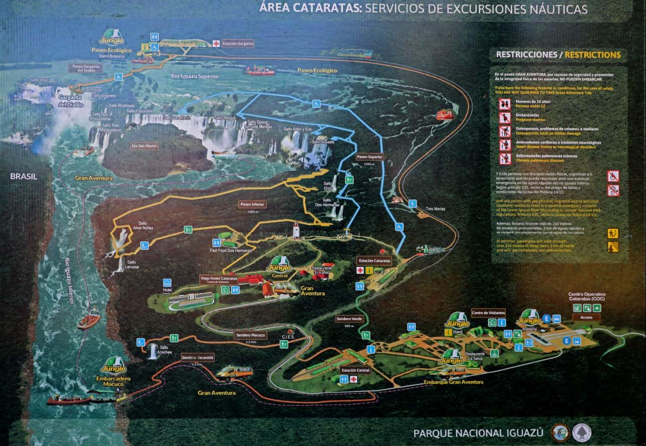 透過房東介紹,我們找到了一位司機兼導遊,帶著我們進入聯合國教科文組織1984年認證的伊瓜蘇瀑布園區門口,就被眼前巨大的瀑布群地圖嚇到,再經由專業人員解說,我們選擇了先衝瀑,隔天再來好好走步道近距離欣賞瀑布群的震撼。