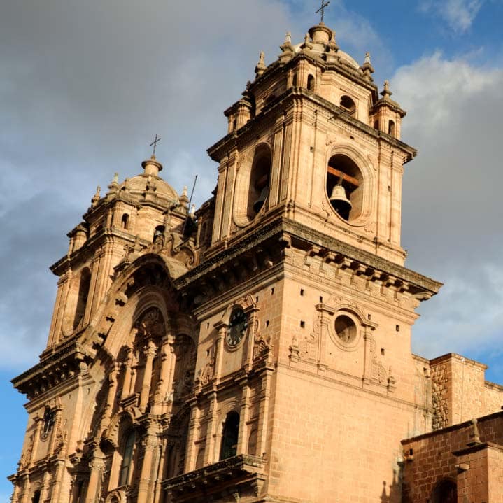 最初的寺廟建於1571年,位於舊阿馬魯坎查(印加華納卡帕克宮殿)的遺址上。1650年地震後,寺廟不得不於1688年重建。那天有幸參觀內部,可以從空氣凝結的氛圍中,感知千百年來印加文明,是多麼深刻畫痕值入人心,耶穌聖殿安撫人心那種無私與大愛!原來的設計和外觀更是安第斯巴洛克風格的典範。寺廟的正面採用重桌式建築,裝飾有中等高度的塔樓,並以精心打造的石牆為特色。進入聖殿後,我們的注意力將被三件式主祭壇和所羅門柱、木製講壇和眾多巴洛克風格、盤子風格和教堂風格的桌子所吸引。