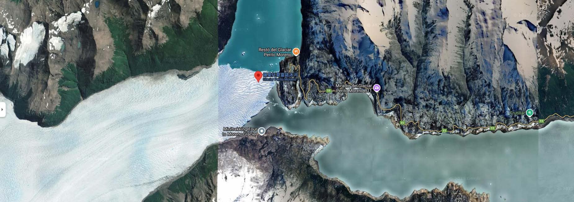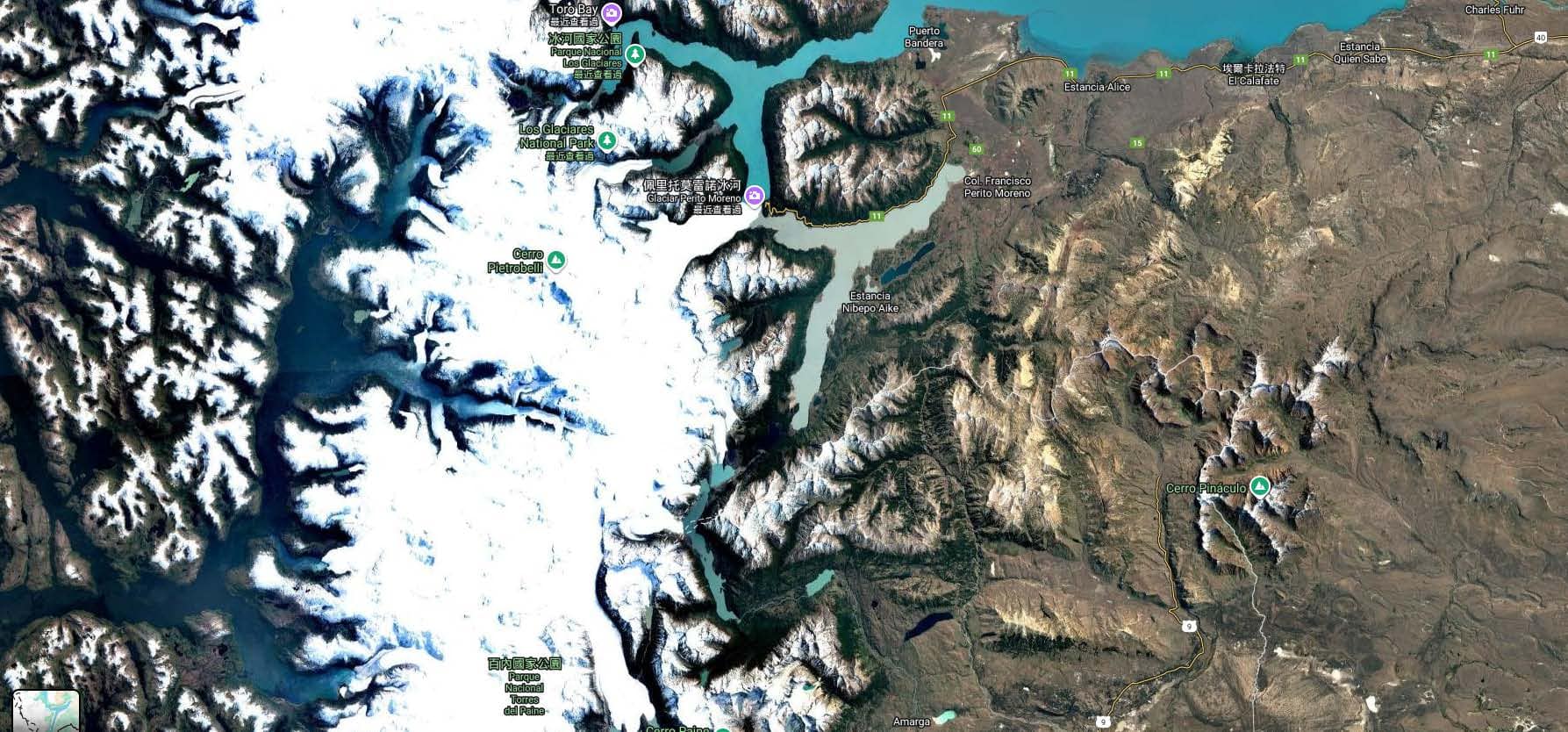 整個冰河國家公園與智利的百內國家公園,其實是相連的,只因為跨越兩個國家,但整個大自然氛圍是相連貫穿的,從衛星空拍圖上清楚可以得知。