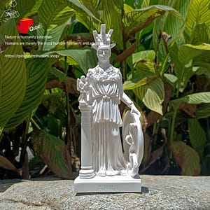This Athena sculpture portrays the elegance and protective presence of the Greek goddess of wisdom. Holding a shield in her left hand and resting her right hand on a column, she cradles a small angel in her palm, symbolizing wisdom, guardianship, and compassion. The snowflake gypsum material finely captures the details of her armor, shield, and angel, perfect for collection or display, bringing dignity, strength, and warmth.